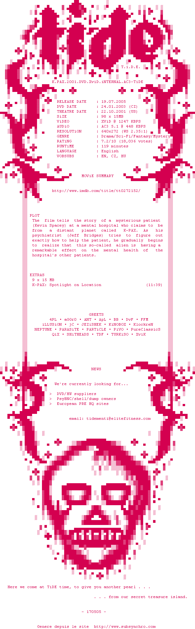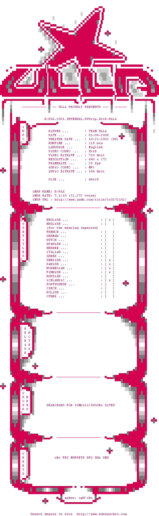 Voir le nfo de la release K.PAX.2001.DVD.XviD.iNTERNAL.AC3-TiDE