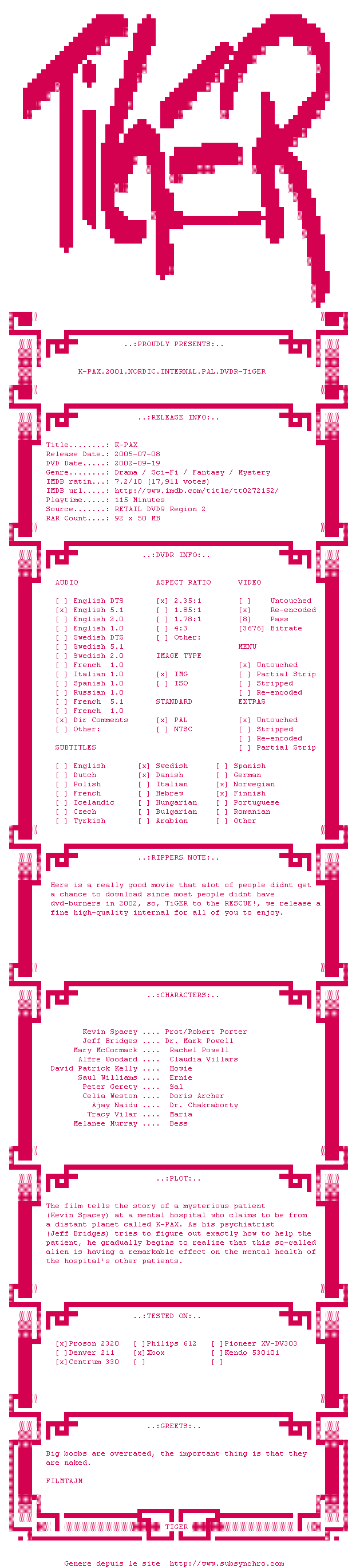 Voir le nfo de la release K-PAX.2001.NORDIC.iNTERNAL.PAL.DVDR-TiGER