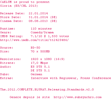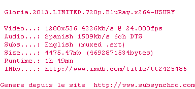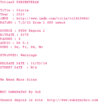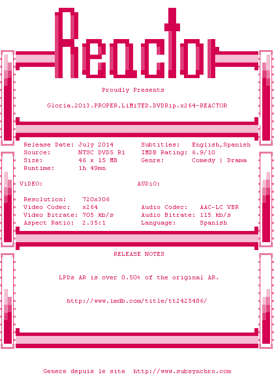 Voir le nfo de la release Gloria.2013.PROPER.LiMiTED.DVDRip.x264-REACTOR