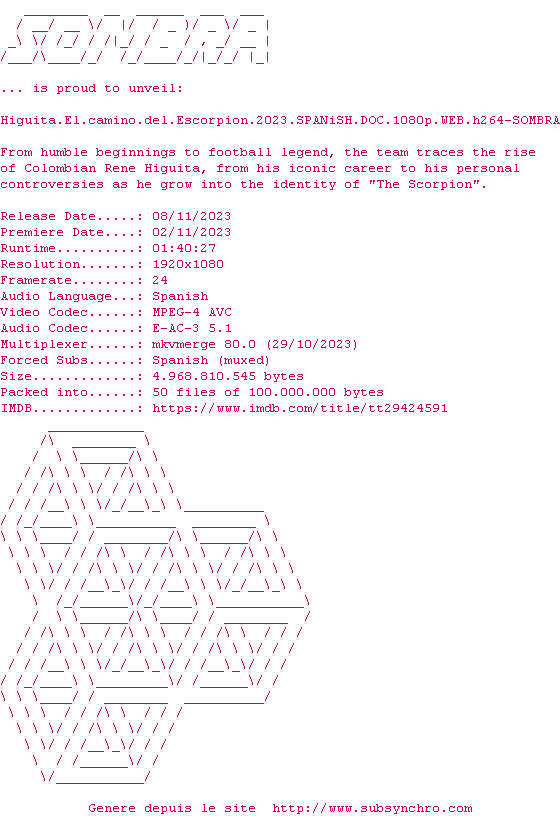 Voir le nfo de la release Higuita.El.Camino.Del.Escorpion.2023.SPANiSH.DOC.1080p.WEB.H264-SOMBRA