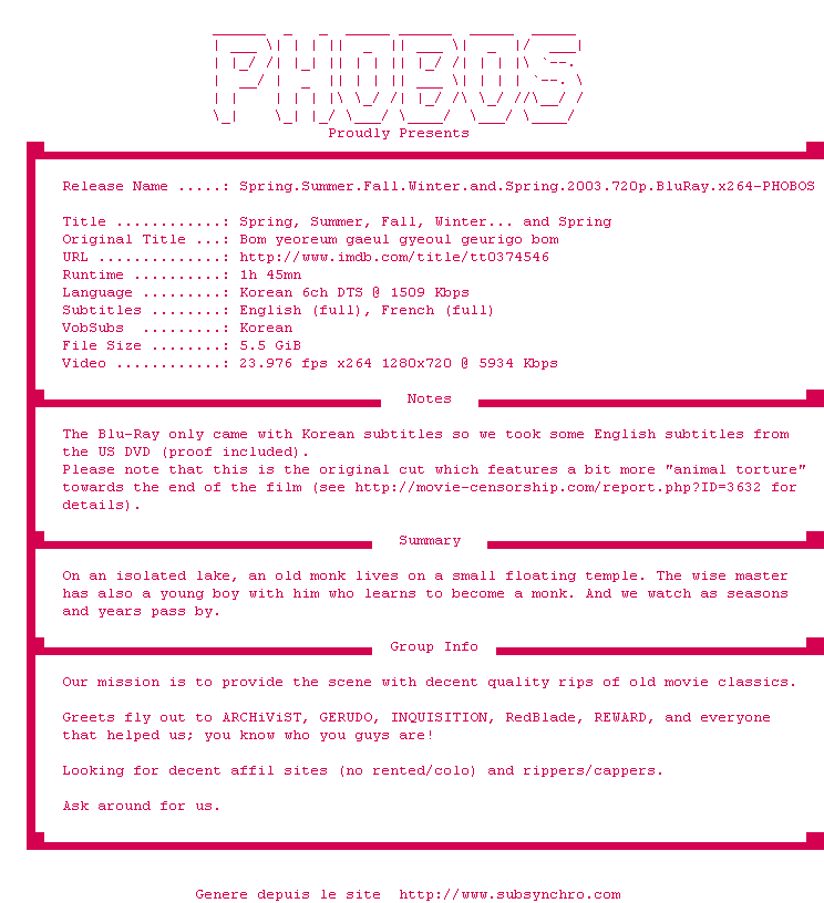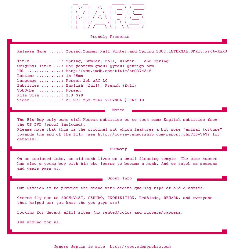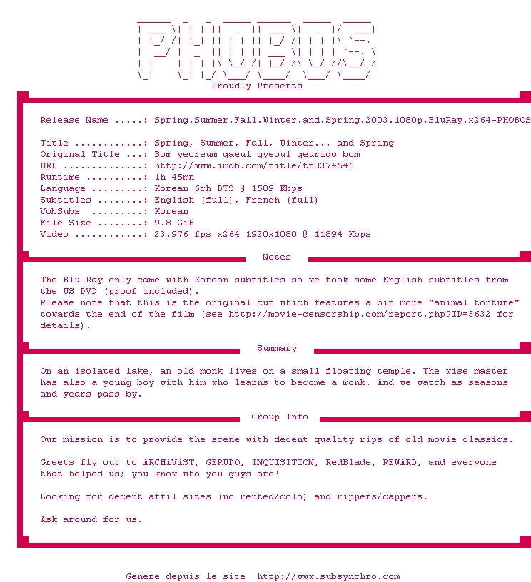 Voir le nfo de la release Spring.Summer.Fall.Winter.And.Spring.2003.DVDRip.XviD-iMBT