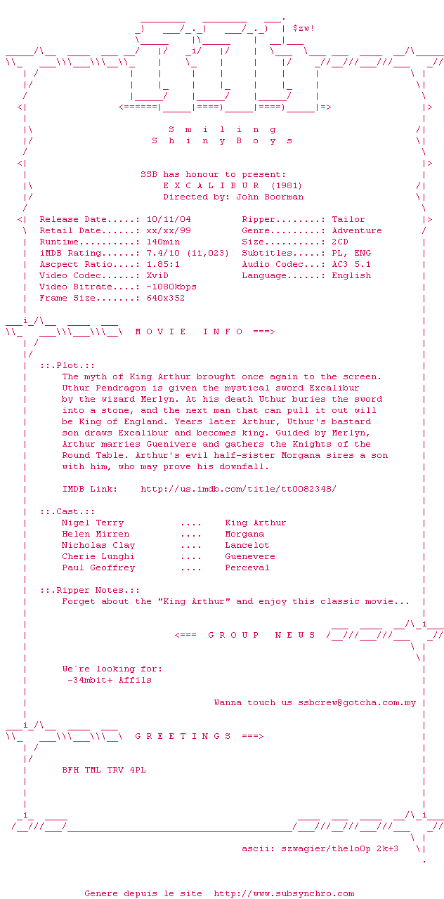 Voir le nfo de la release Excalibur.1981.iNTERNAL.DVDRip.XViD-SSB