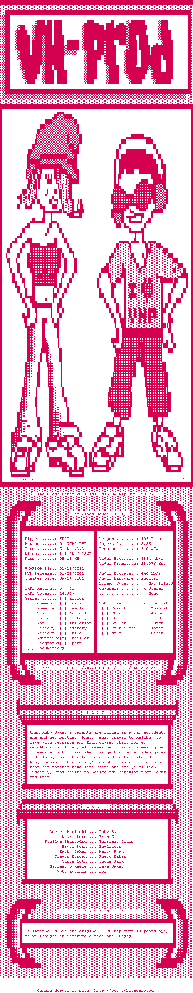 Voir le nfo de la release The.Glass.House.2001.iNTERNAL.DVDRip.XviD-VH-PROD