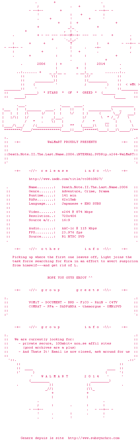 Voir le nfo de la release Death.Note.II.The.Last.Name.2006.iNTERNAL.DVDRip.x264-WaLMaRT