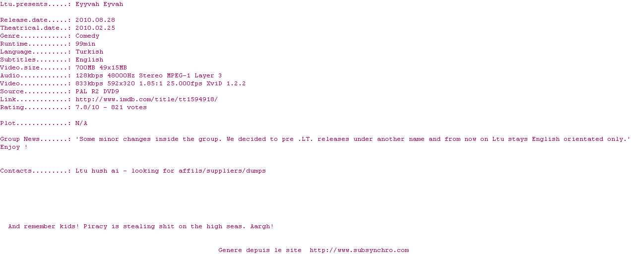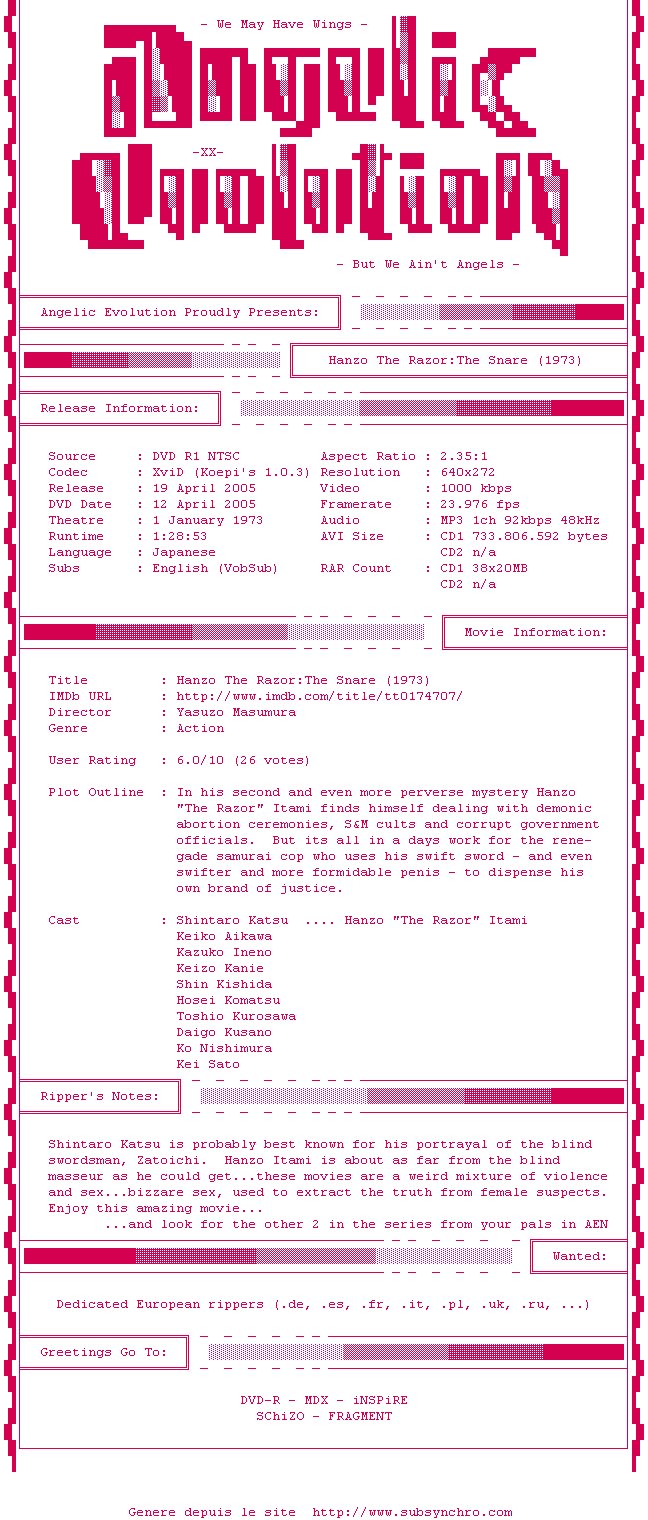 Voir le nfo de la release Hanger.UNCUT.German.2009.PAL.DVDR-ILOM