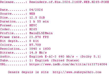 La release Reminders.Of.Him.2026.2160p.AMZN.WEB-DL.DDP5.1.H.265-GTM est en 4K