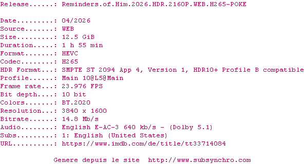 La release Reminders.Of.Him.2026.2160p.AMZN.WEB-DL.DDP5.1.HDR.H.265-GTM est en 4K
