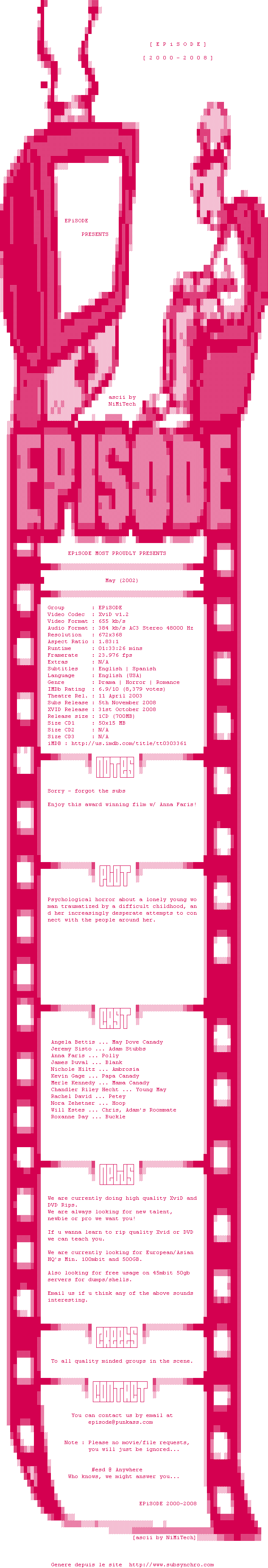Voir le nfo de la release May.2002.WS.DVDRip.XviD.SUBPACK-EPiSODE