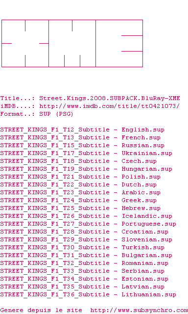Voir le nfo de la release Street.Kings.2008.SUBPACK.BluRay-XME
