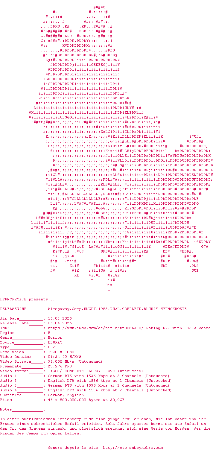 Voir le nfo de la release Sleepaway.Camp.UNCUT.1983.DUAL.COMPLETE.BLURAY-HYPNOKROETE