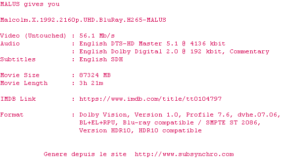 Voir le nfo de la release Malcolm.X.1992.2160p.UHD.BluRay.H265-MALUS