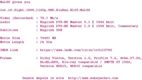 Voir le nfo de la release Out.Of.Sight.1998.2160p.UHD.BluRay.H265-MALUS
