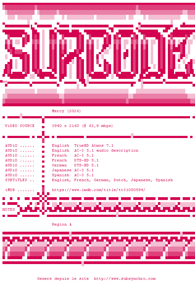 Voir le nfo de la release Mercy.2026.COMPLETE.UHD.BLURAY-SURCODE