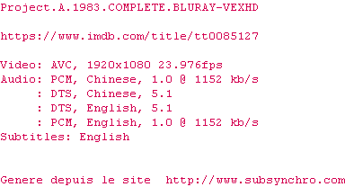 Voir le nfo de la release Project.A.1983.1080p.DUBBED.BluRay.x264-MOOVEE