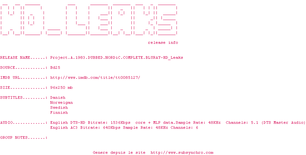 Voir le nfo de la release Project.A.1983.DUBBED.NORDiC.COMPLETE.BLURAY-HD_Leaks
