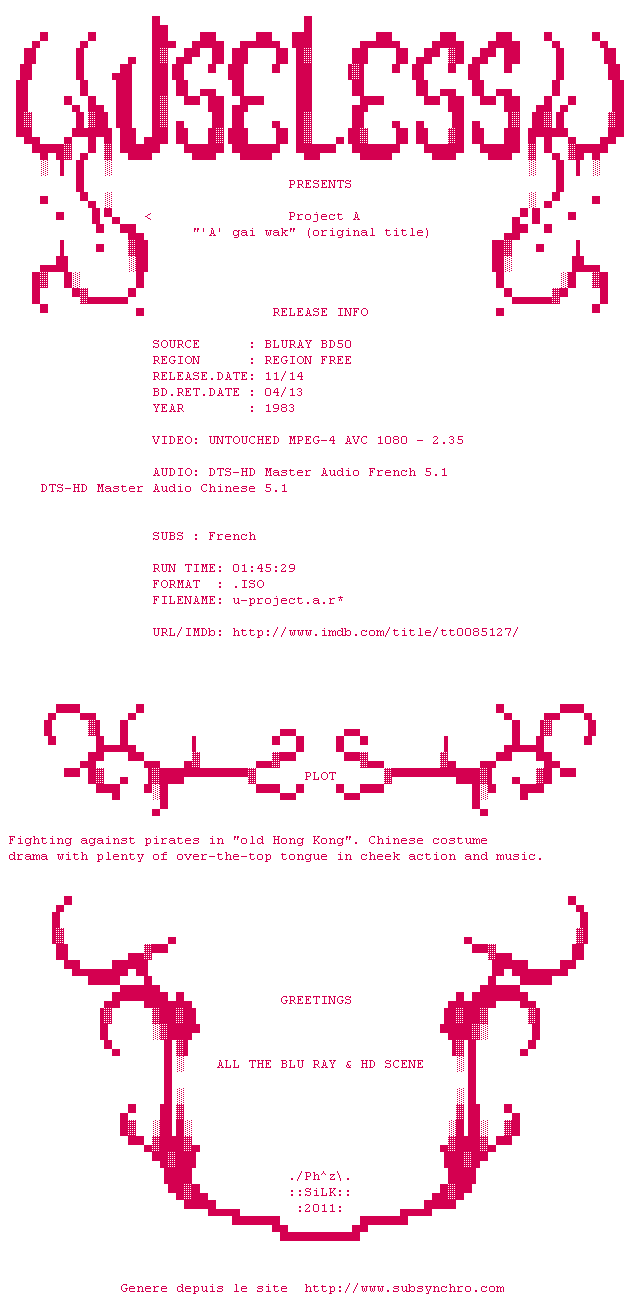 Voir le nfo de la release Project.A.1983.MULTi.COMPLETE.BLURAY-USELESS