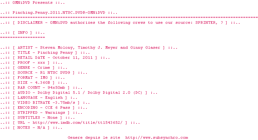 Voir le nfo de la release Pinching.Penny.2011.NTSC.DVDR-0MNiDVD