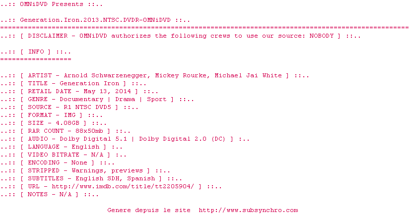 Voir le nfo de la release Generation.Iron.2013.NTSC.DVDR-0MNiDVD