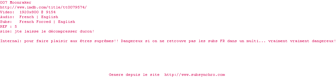 Voir le nfo de la release 007.Moonraker.1979.1080p.MULTI.iNTERNAL.BluRay.x264-1080