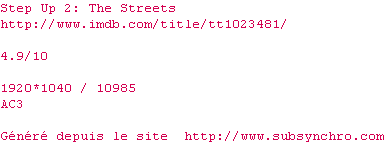 Voir le nfo de la release Step.Up.2.The.Streets.1080p.Bluray.x264-1920
