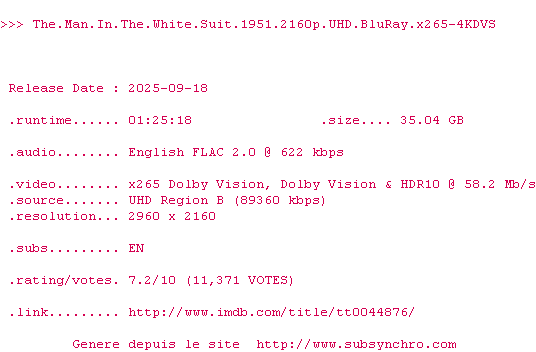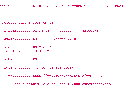 Voir le nfo de la release The.Man.In.The.White.Suit.1951.COMPLETE.UHD.BLURAY-4KDVS