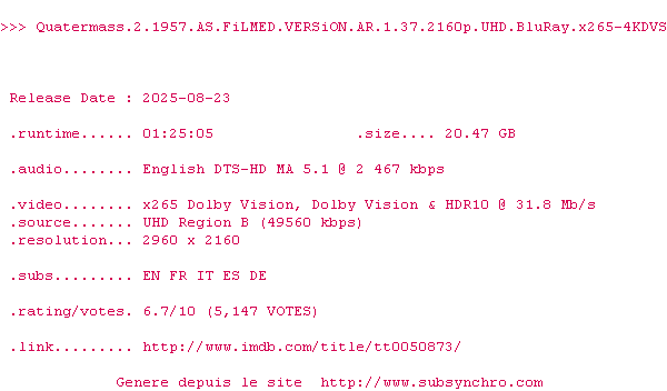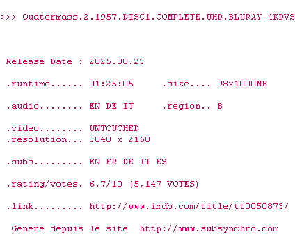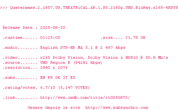 Voir le nfo de la release Quatermass.2.1957.US.THEATRiCAL.AR.1.85.2160p.UHD.BluRay.x265-4KDVS