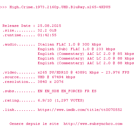 Voir le nfo de la release High.Crime.1973.2160p.UHD.BluRay.x265-4KDVS