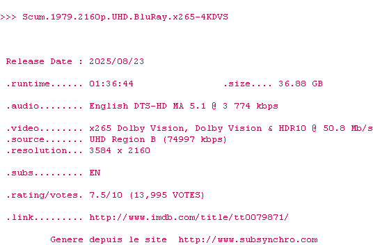 Voir le nfo de la release Scum.1979.2160p.UHD.BluRay.x265-4KDVS
