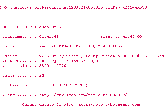 Voir le nfo de la release The.Lords.Of.Discipline.1983.2160p.UHD.BluRay.x265-4KDVS