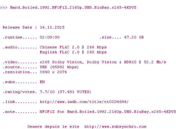 Voir le nfo de la release Lilo.And.Stitch.2025.2160p.UHD.BluRay.x265-4KDVS