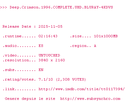 Voir le nfo de la release Trouble.Every.Day.2001.2160p.UHD.BluRay.x265-4KDVS