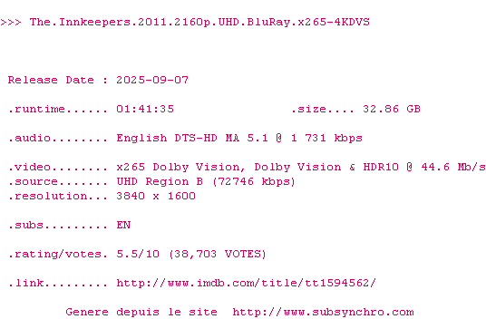 Voir le nfo de la release The.Innkeepers.2011.COMPLETE.UHD.BLURAY-4KDVS