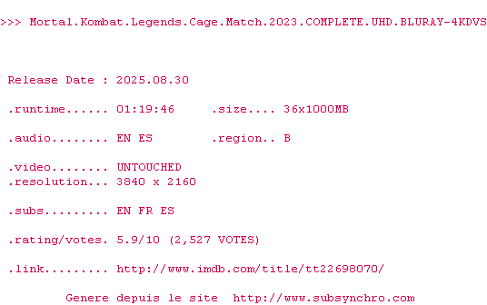 Voir le nfo de la release Mortal.Kombat.Legends.Cage.Match.2023.COMPLETE.UHD.BLURAY-4KDVS