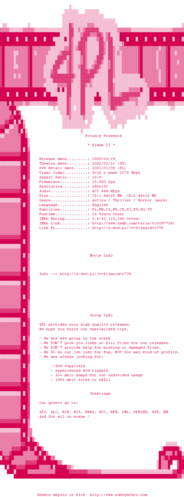 Voir le nfo de la release Blade.II.2002.iNTERNAL.DVDRip.XviD-4PL