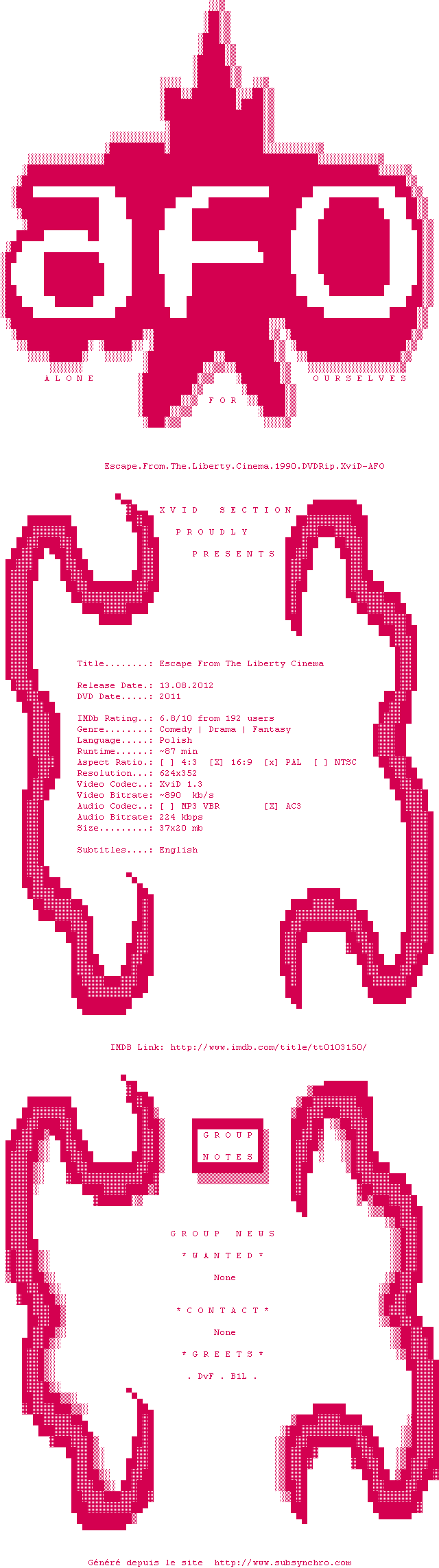 Voir le nfo de la release Escape.From.The.Liberty.Cinema.1990.DVDRip.XviD-AFO