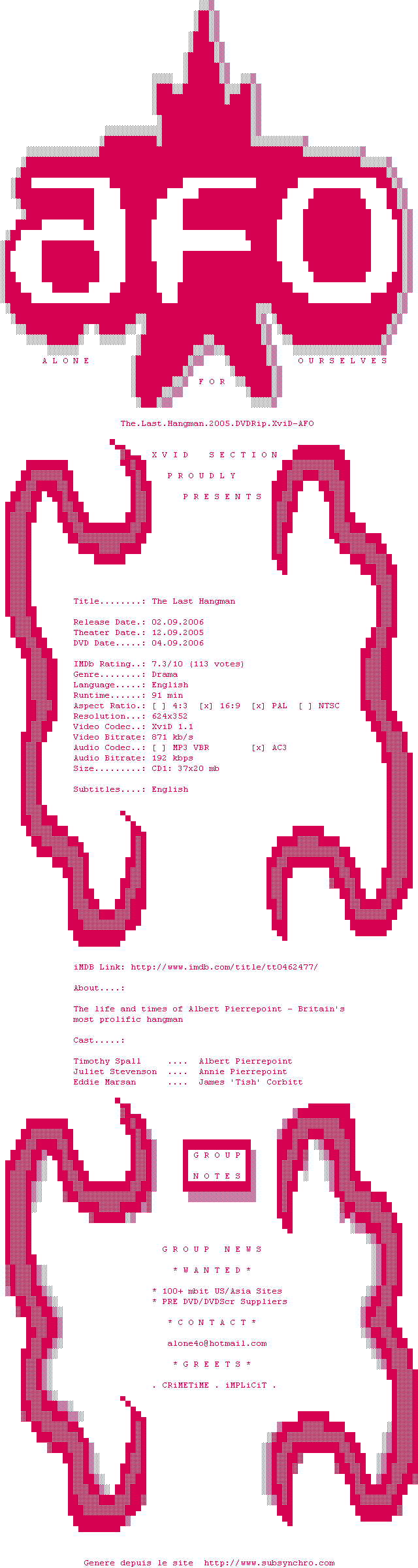 Voir le nfo de la release The.Last.Hangman.2005.DVDRip.XviD-AFO