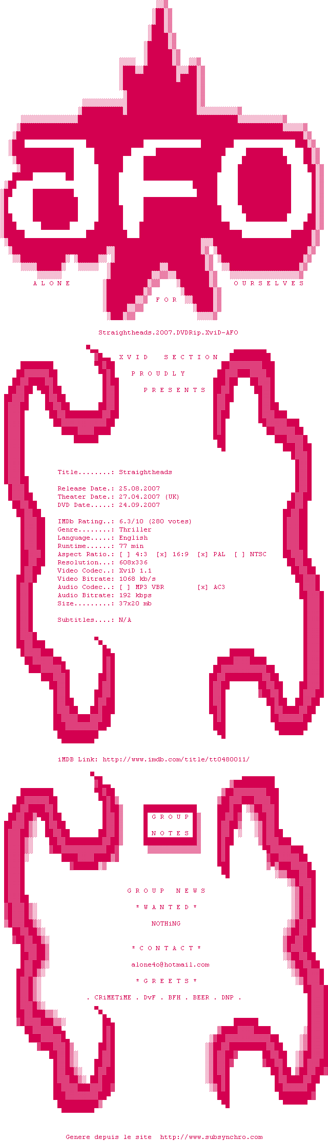 Voir le nfo de la release Straightheads.2007.DVDRip.XviD-AFO