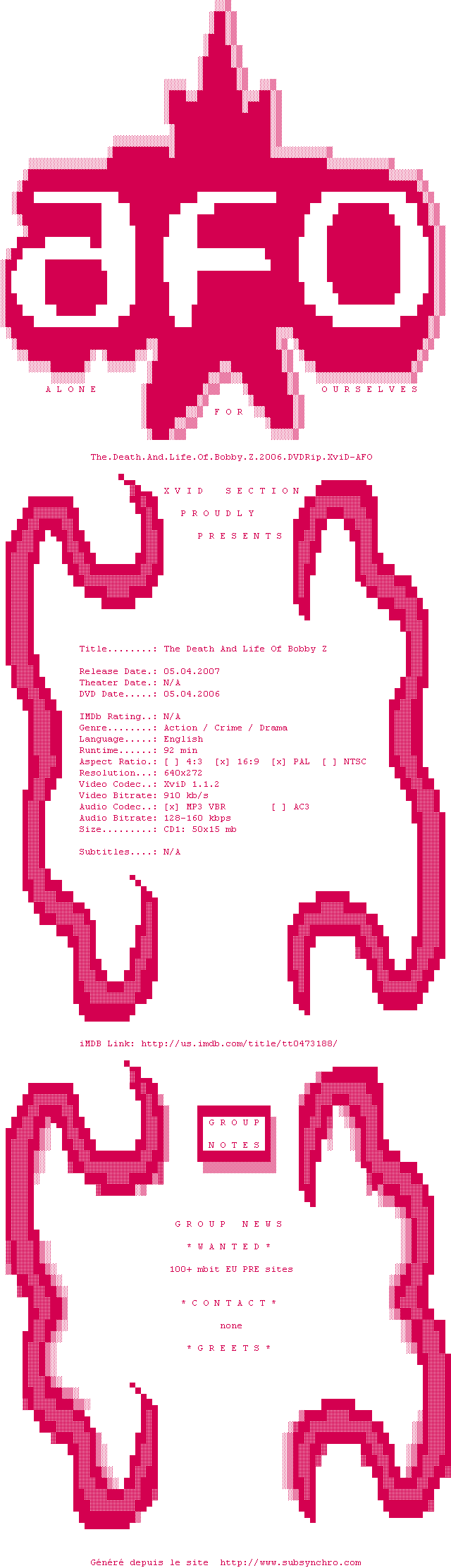 Voir le nfo de la release The.Death.And.Life.Of.Bobby.Z.2006.DVDRip.XviD-AFO