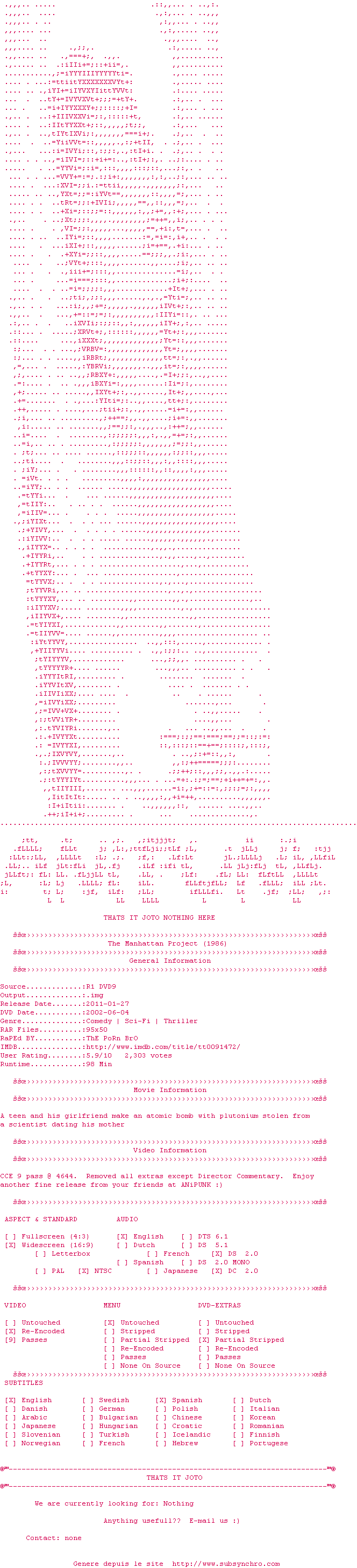 Voir le nfo de la release The.Manhattan.Project.1986.iNT.NTSC.DVDR-ANiPUNK
