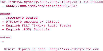 Voir le nfo de la release The.Teckman.Mystery.1954.1080p.BluRay.x264-ARCHFiLLER