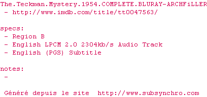 Voir le nfo de la release The.Teckman.Mystery.1954.COMPLETE.BLURAY-ARCHFiLLER