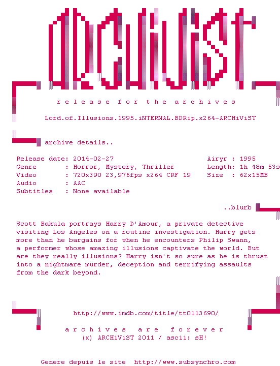Voir le nfo de la release Lord.of.Illusions.1995.iNTERNAL.BDRip.x264-ARCHiViST