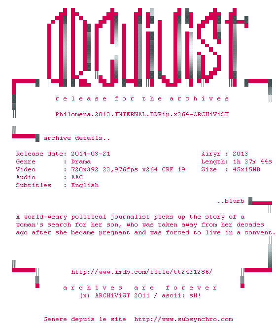 Voir le nfo de la release Philomena.2013.INTERNAL.BDRip.x264-ARCHiViST