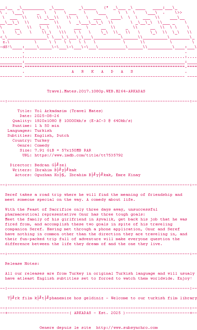 Voir le nfo de la release Travel.Mates.2017.1080p.WEB.H264-ARKADAS