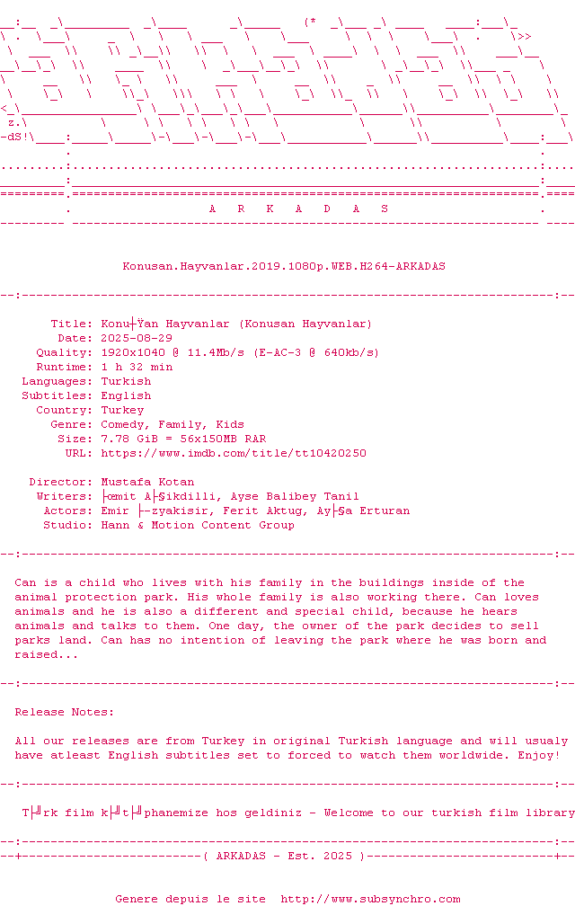 Voir le nfo de la release Konusan.Hayvanlar.2019.1080p.WEB.H264-ARKADAS