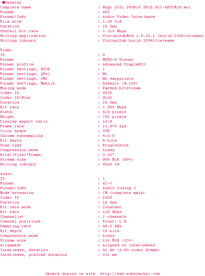 Voir le nfo de la release Hugo.2011.DVDRiP.XViD.AC3-ART3MiS