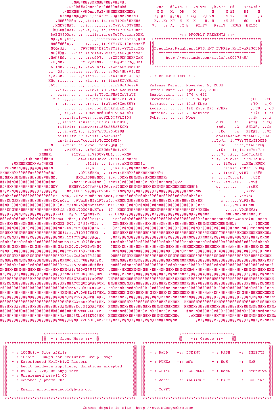 Voir le nfo de la release Draculas.Daughter.1936.iNT.DVDRip.XviD-ARiGOLD