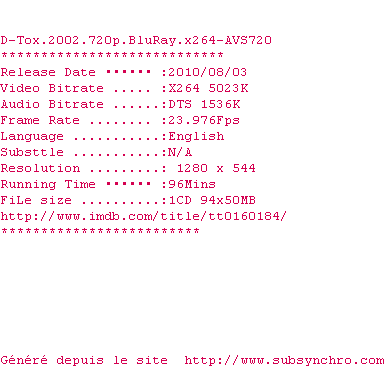 Voir le nfo de la release Salt.2010.DC.720p.BluRay.x264-AVS720