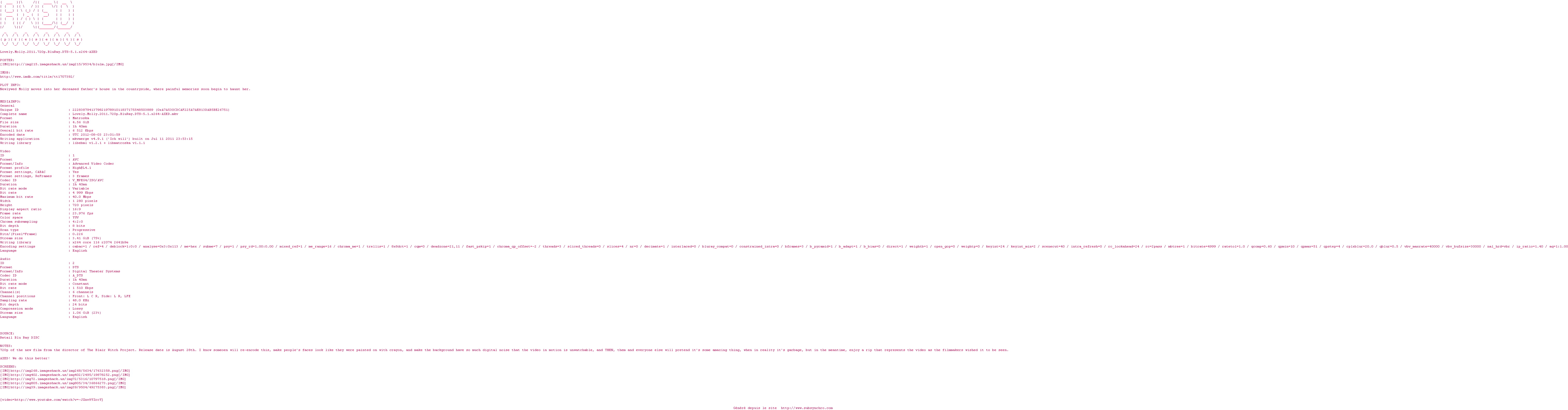 Voir le nfo de la release Lovely.Molly.2011.720p.BluRay.DTS-5.1.x264-AXED