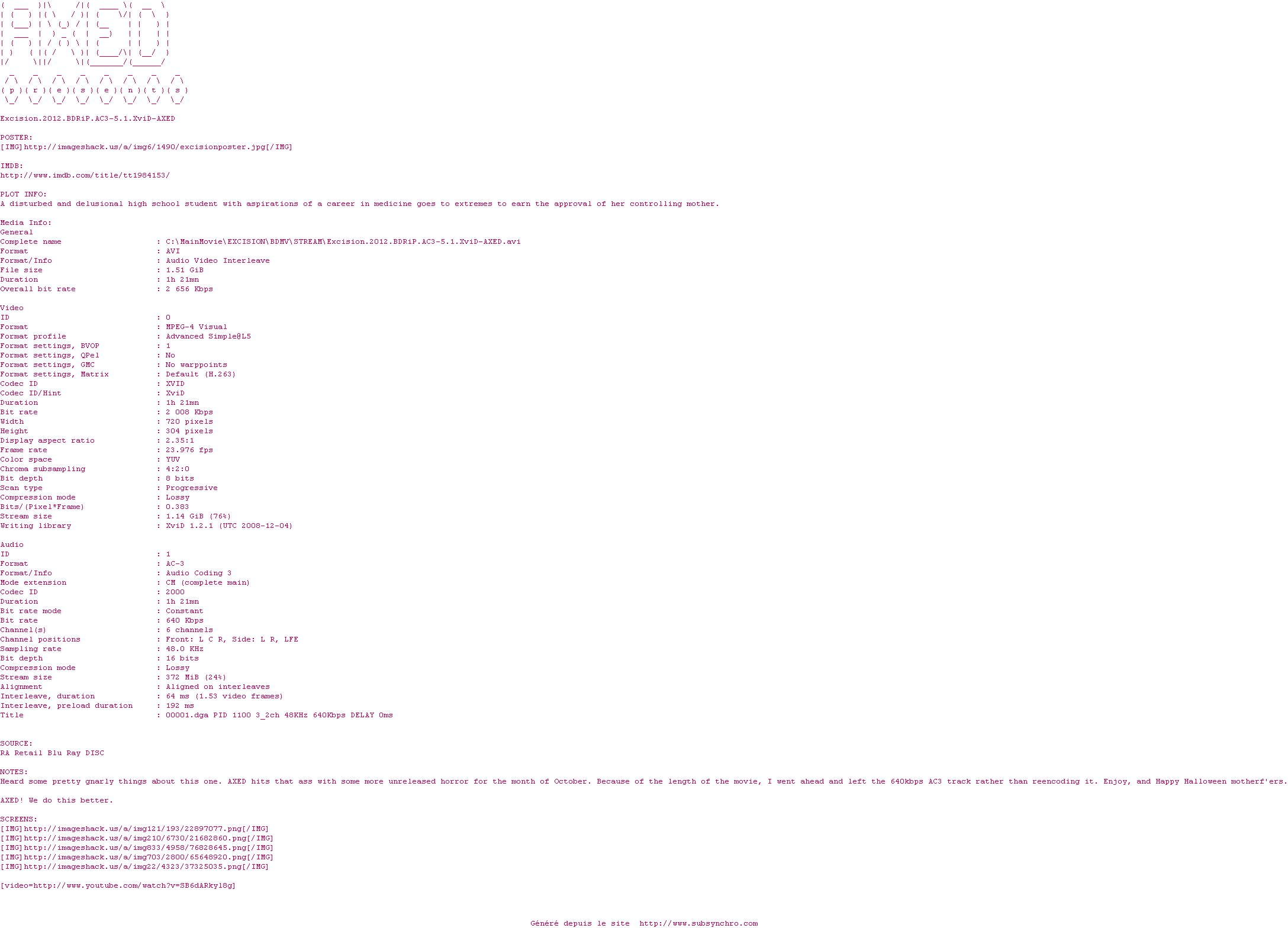 Voir le nfo de la release Excision.2012.BDRiP.AC3-5.1.XviD-AXED
